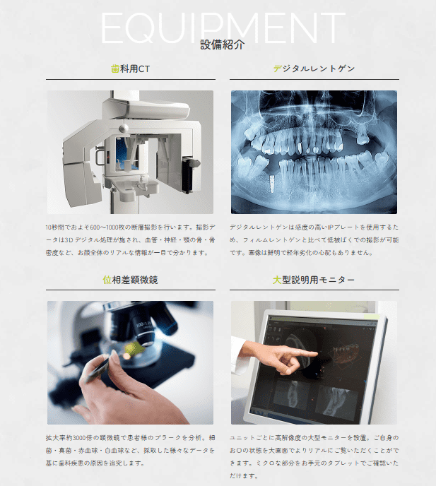 歯科用CTやマイクロスコープ、口腔内スキャナーなど、先端機器の導入状況も、患者さまが注目しているポイントのひとつです。