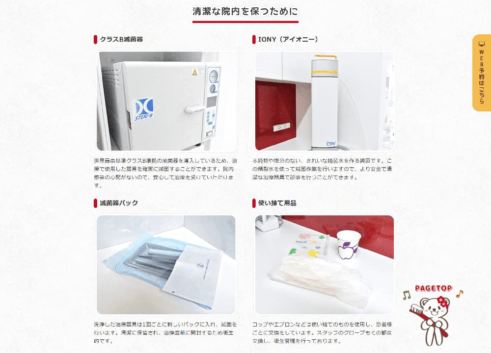 ホームページ上で、滅菌器の導入状況や器具の管理方法、診療ごとの交換ルールなどを明確に示すことで、院内の衛生意識の高さが伝わります。